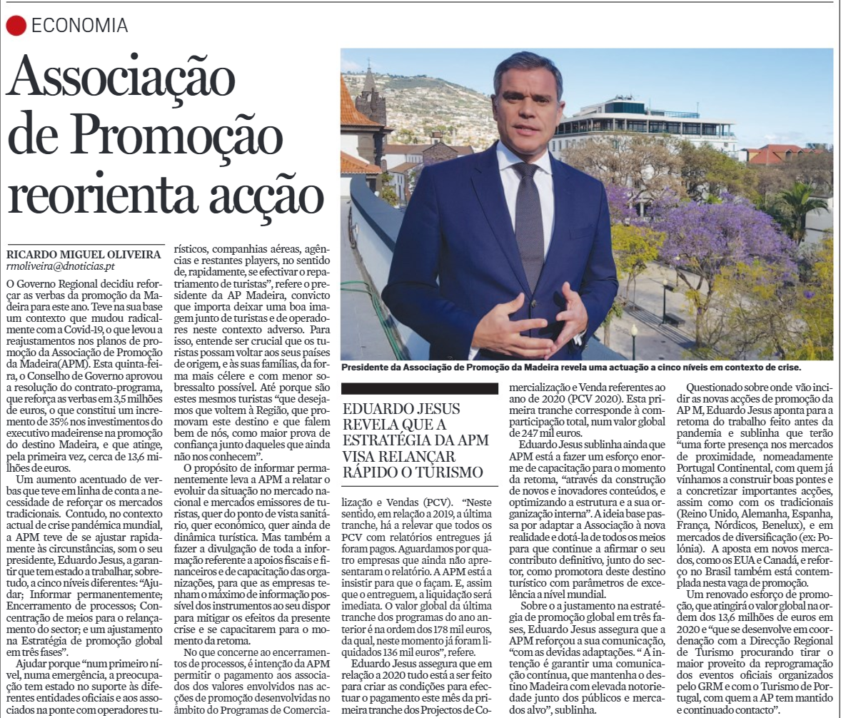 O secretário regional diz igualmente na entrevista que a APM está a fazer um esforço enorme de capacitação para o momento da retoma, “através da construção de novos e inovadores conteúdos, e otimizando a estrutura e a sua organização interna”. A ideia base passa por adaptar a Associação à nova realidade e dotá-la de todos os meios para que continue a afirmar o seu contributo definitivo. Junto do setor, como promotora deste destino turístico com parâmetros de excelência a nível internacional.