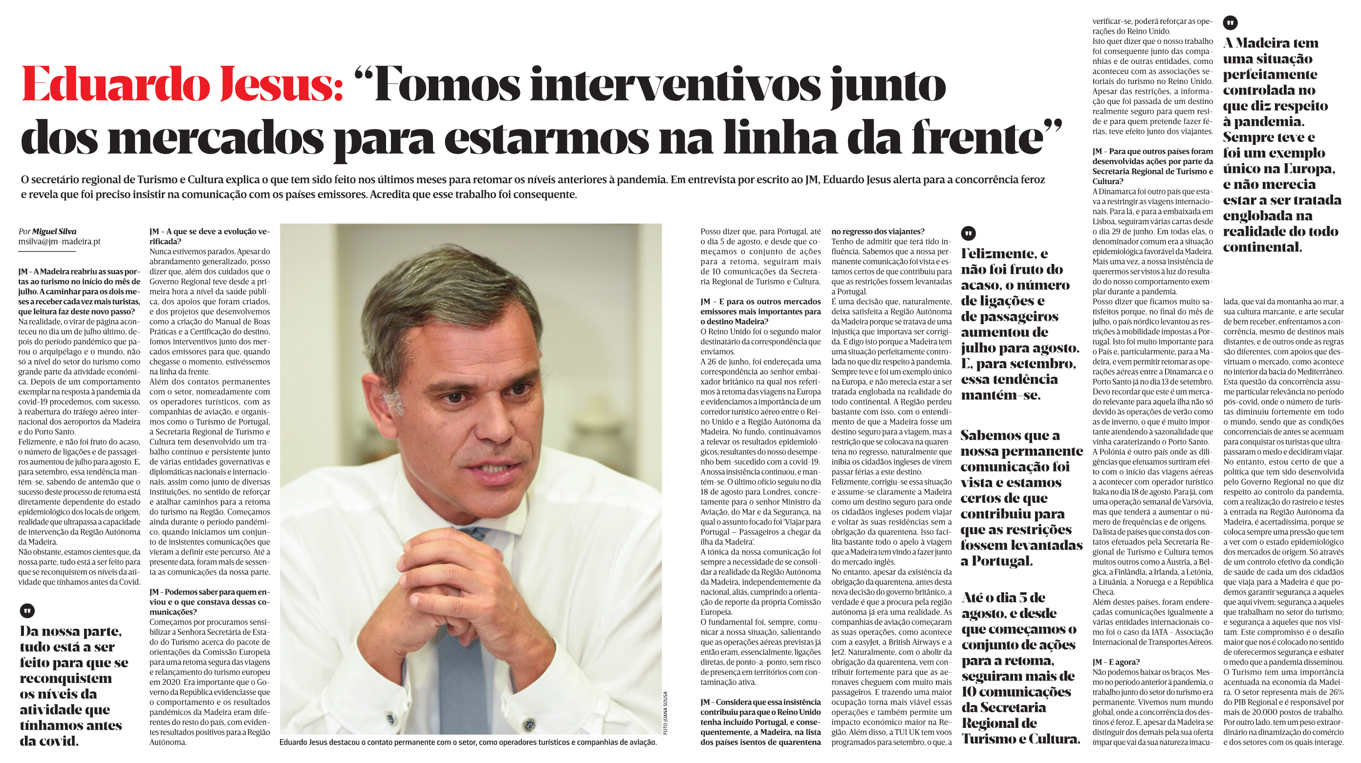 Além dos contatos permanentes com o setor, nomeadamente com os operadores turísticos, com as companhias de aviação, e organismos como o Turismo de Portugal, a Secretaria Regional de Turismo e Cultura tem desenvolvido um trabalho contínuo e persistente junto de várias entidades governativas e diplomáticas nacionais e internacionais, assim como junto de diversas instituições, no sentido de reforçar e atalhar caminhos para a retoma do turismo na Região. Começamos ainda durante o período pandémico, quando iniciamos um conjunto de insistentes comunicações que vieram a definir este percurso”.