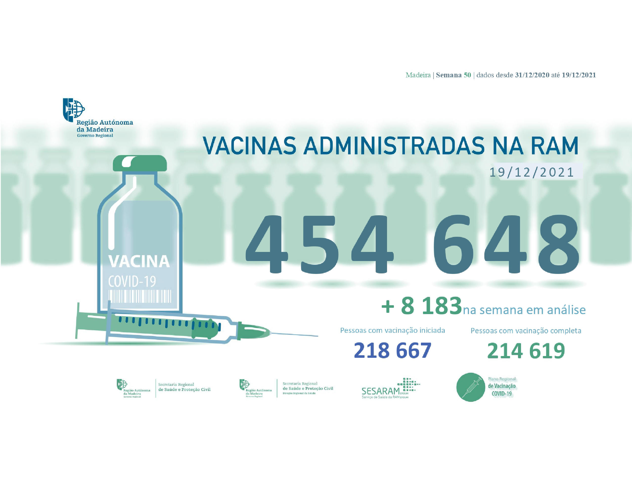 Do número total de vacinas administradas na RAM (454 648), 218 667 correspondem à administração da primeira dose, 214 619 doses de vacinação completa e 47 817 doses de reforço/adicionais.
