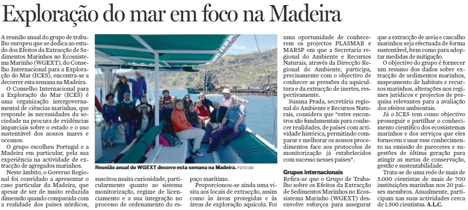 A reunião anual do grupo de trabalho europeu que se dedica ao estudo dos Efeitos da Extração de Sedimentos Marinhos no Ecossistema Marinho (WGEXT), do Conselho Internacional para a Exploração do Mar (ICES), encontra-se a decorrer esta semana na Madeira.