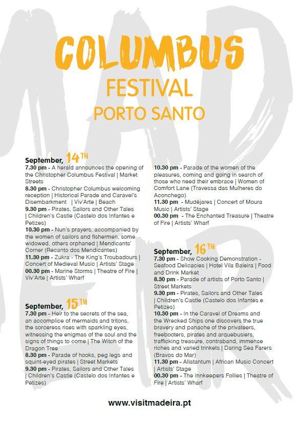 The Colombo Festival is based on the historical recreation of the time when the Genoese merchant lived on the island of Porto Santo. The program includes the disembarkation of Colombo, a sixteenth-century market, where gastronomy, handicrafts, arcades, circus arts, theatricals and staging of peace and war perpendices are common at the time, games of skill, weapons training, acrobatics and juggling, music and exotic dances, guaranteeing constant animation and constant excitement among the many characteristic figures of the time, which enchant residents and tourists alike.