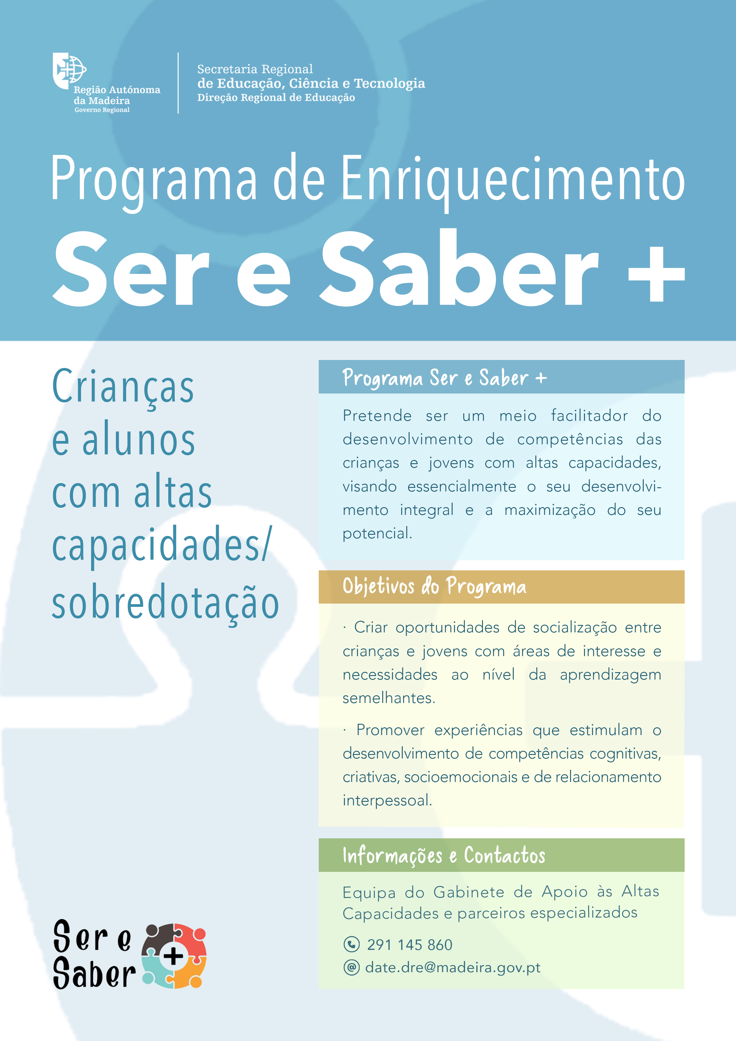 O Programa Ser e Saber + pretende ser um meio facilitador do desenvolvimento de competências das crianças e jovens com altas capacidades, visando essencialmente o seu desenvolvimento integral e a maximização do seu potencial.