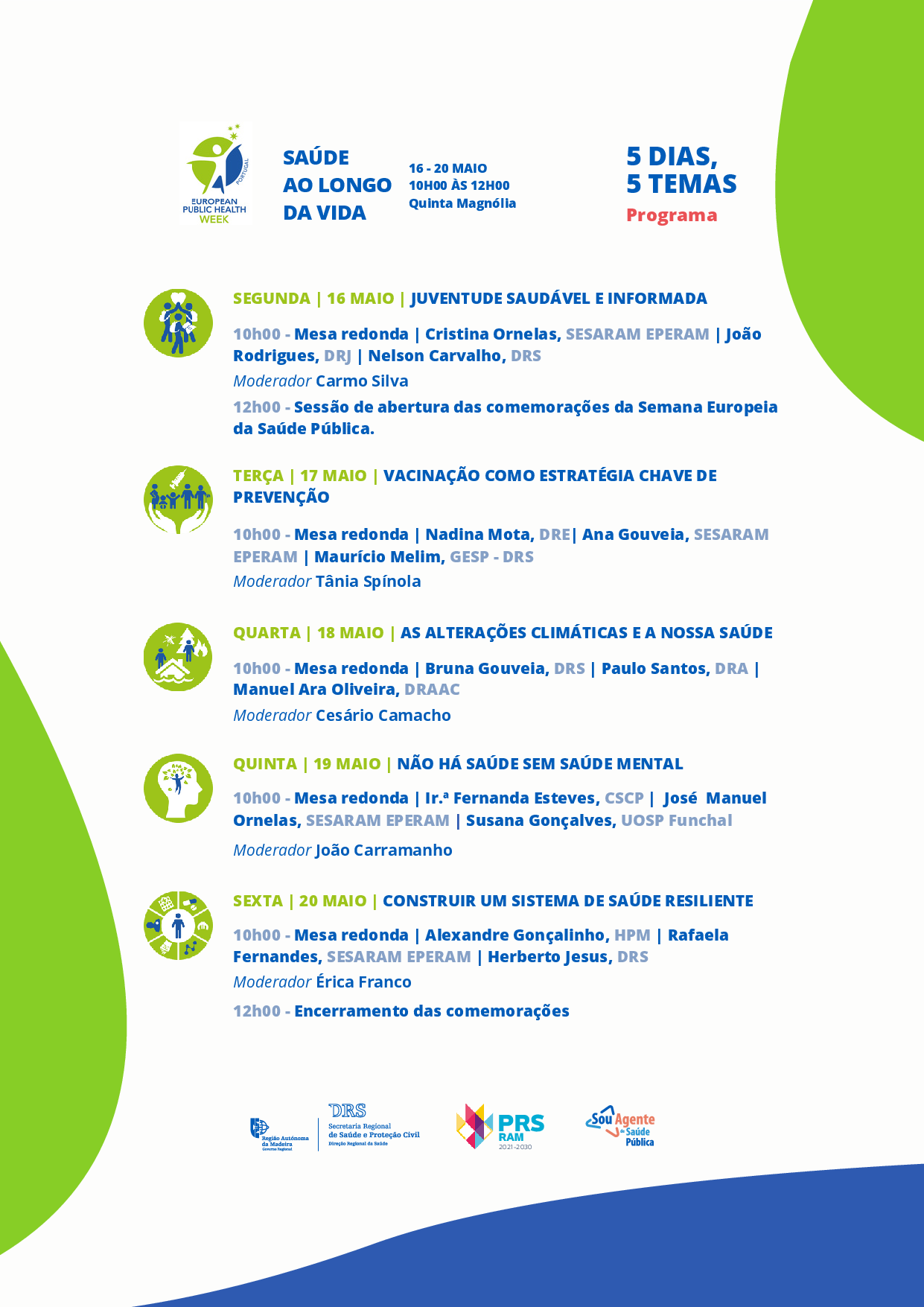 Ao longo de cinco dias são vários os temas propostos para debate e reflexão participativa dos profissionais e demais intervenientes, nomeadamente: 16 de maio: Juventude saudável e informada 17 de maio: Vacinação como estratégia de prevenção chave 18 de maio: Alterações climáticas e a nossa saúde 19 de maio: Não há saúde sem saúde mental 20 de maio: Construir sistemas de saúde resilientes
