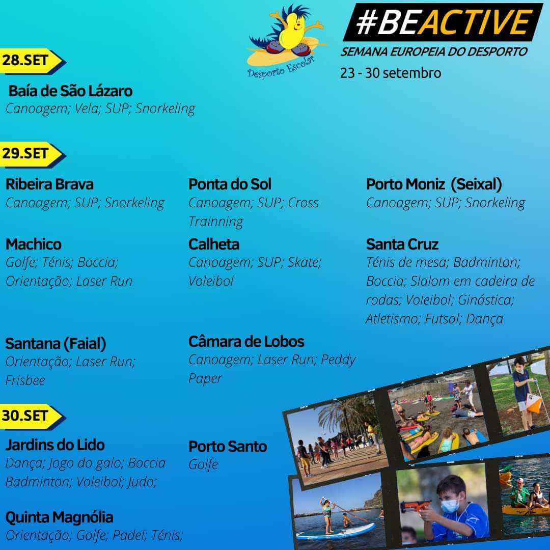 Sob o lema #BEACTIVE, a Semana Europeia do Desporto visa promover a prática regular do desporto e da atividade física, bem como a adoção de hábitos de vida saudável ao longo da vida, independentemente da idade, género, contexto social ou nível de aptidão física. Na Madeira, este evento irá abranger todos os concelhos, promovendo o desporto para todos, desde os mais jovens até os mais veteranos.