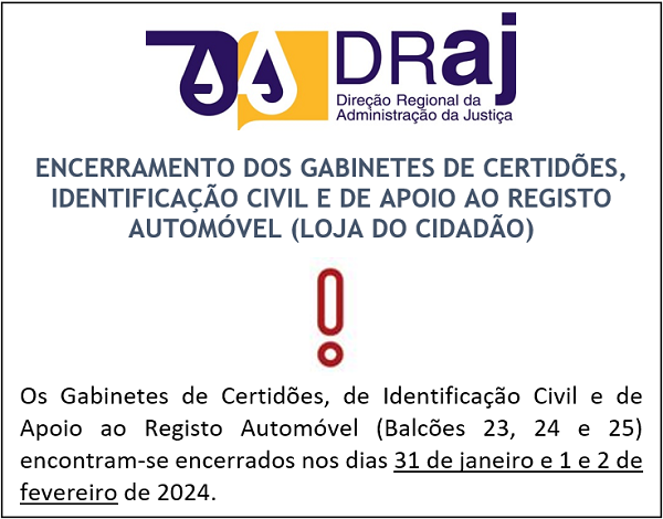 Encerramento dos Gabinetes de Certidões, de Identificação Civil e de Apoio ao Registo Automóvel da Loja do Cidadão. Clique para saber mais informações.