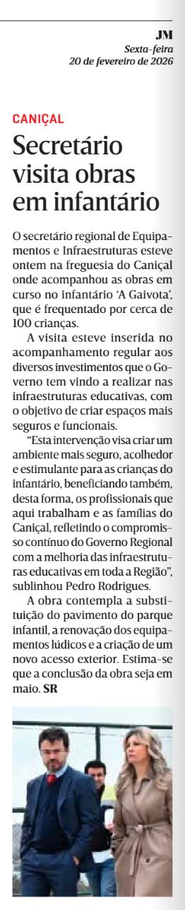 O Secretário Regional de Equipamentos e Infraestruturas, Pedro Rodrigues, esteve esta quinta-feira na freguesia do Caniçal para acompanhar as obras em curso no Infantário “A Gaivota”.