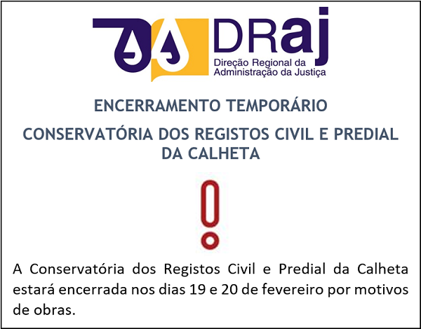 A Conservatória de Registos Civil e Predial da Calheta estará encerrada nos dias 19 e 20 de fevereiro, por motivos de obras.