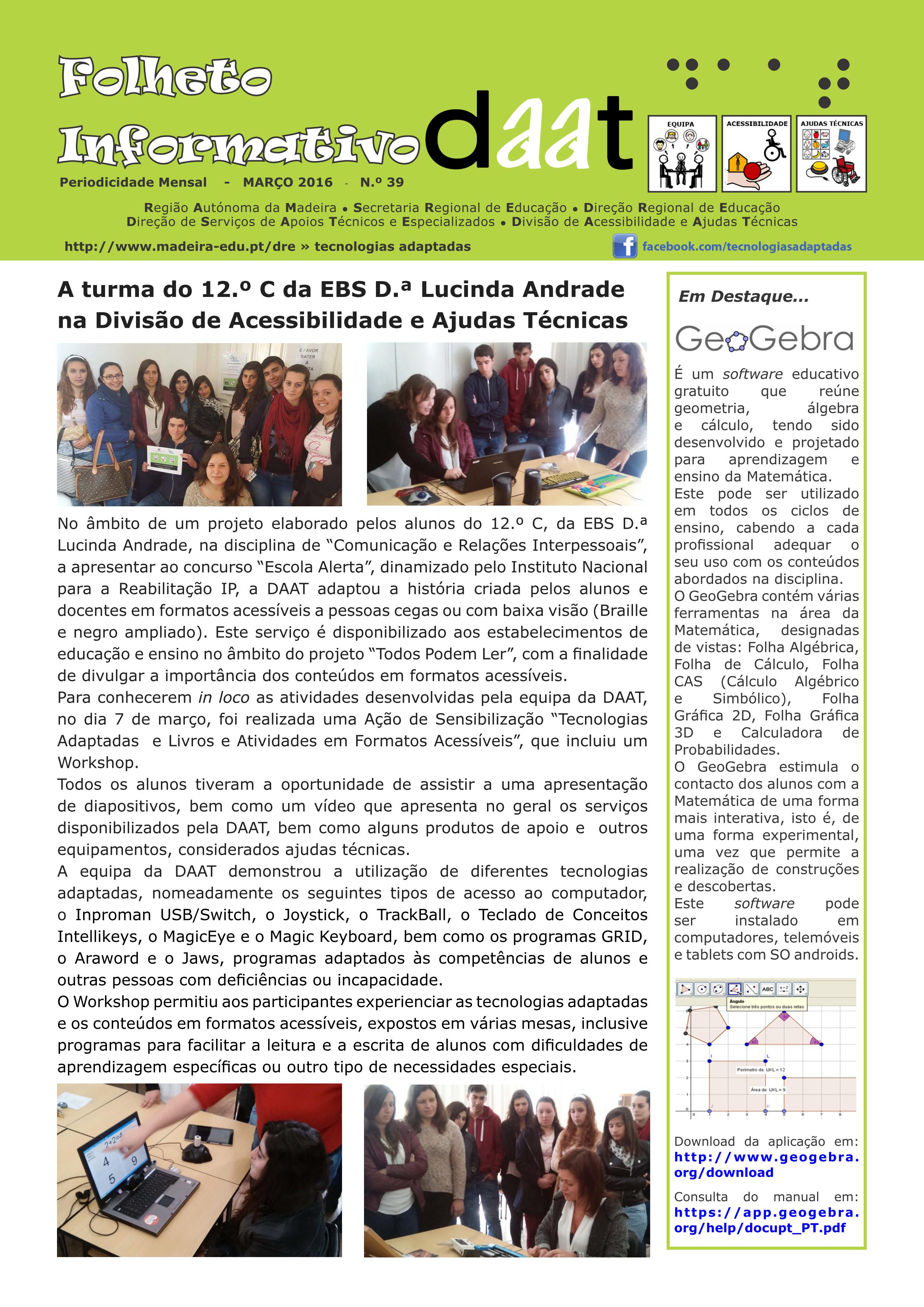 Folheto informativo N.º 39, da Divisão de Acessibilidade e Ajudas Técnicas, da Direção de Serviços de Apoios Técnicos e Especializados sobre "Tecnologias Adaptadas na Educação", referente ao mês de março de 2016.