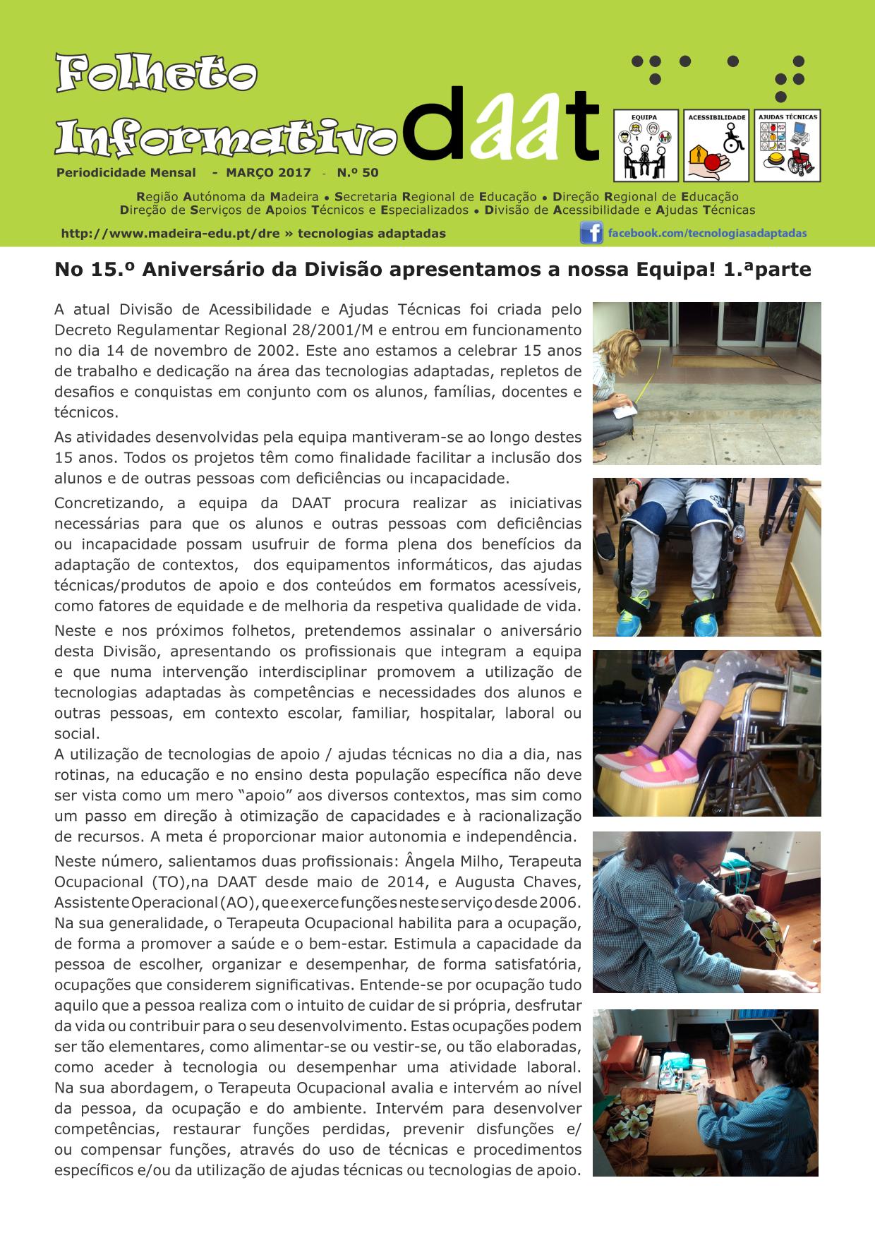 Folheto informativo N.º 50, da Divisão de Acessibilidade e Ajudas Técnicas, da Direção de Serviços de Apoios Técnicos e Especializados sobre "Tecnologias Adaptadas na Educação", referente ao mês de março de 2017.