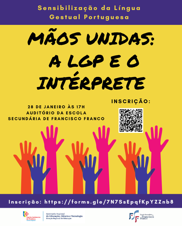 Ação de sensibilização “Mãos Unidas: LGP e o Intérprete”, na Escola Secundária de Francisco Franco, destinada a docentes dessa Escola de Referência para a Educação Bilingue de Alunos Surdos, no próximo dia 28 de janeiro.