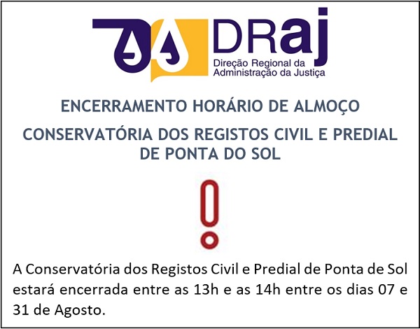 A Conservatória dos Registos Civil e Predial de Ponta de Sol estará encerrada entre as 13h e as 14h entre os dias 07 e 31 de Agosto.