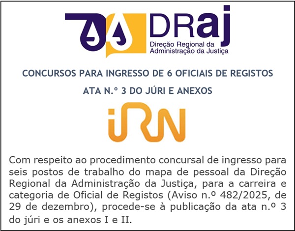 Concurso Externo para 6 Oficiais de Registo - Publicitação da Ata 3 do Júri e Anexos I e II