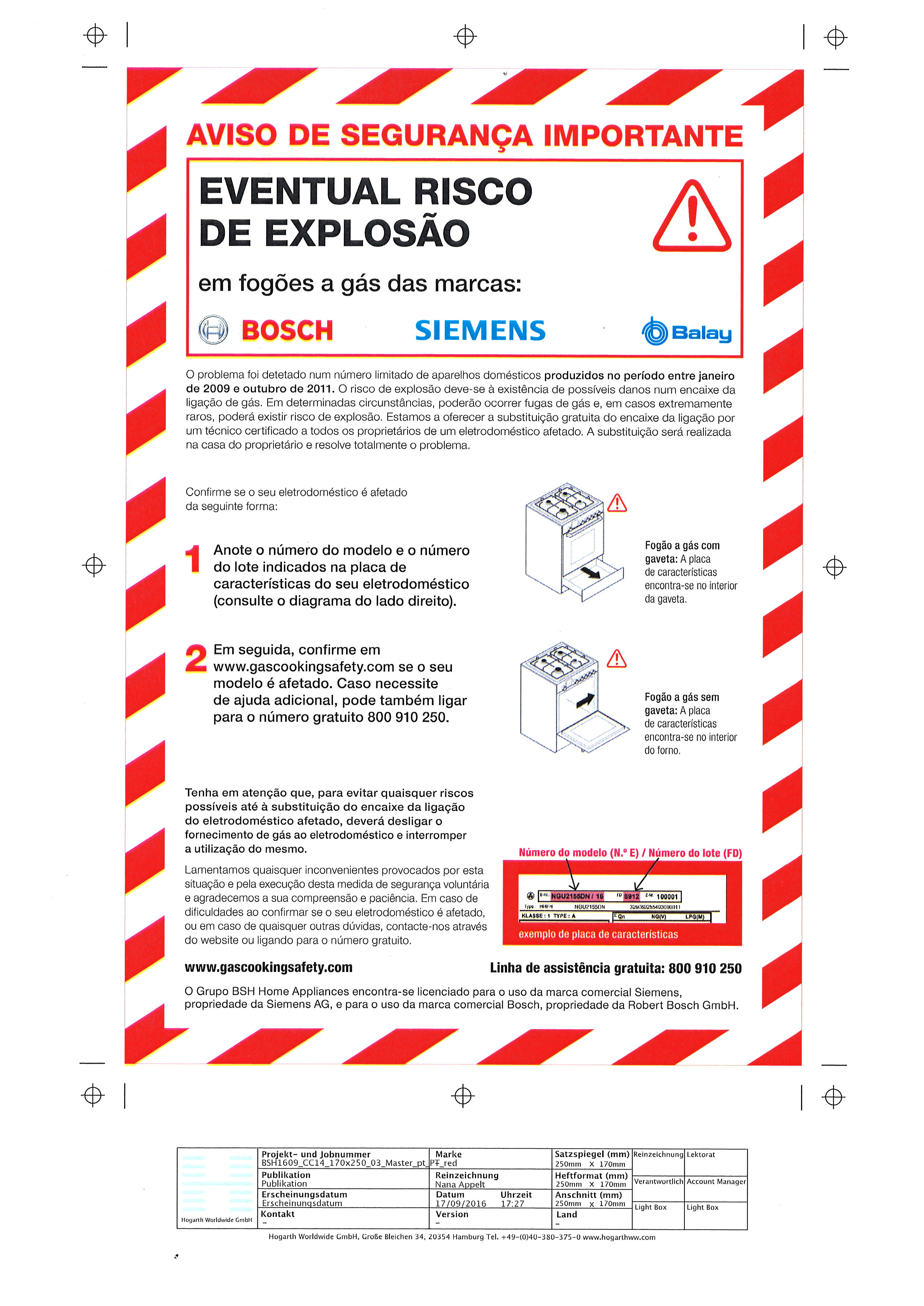 AVISO DE SEGURANÇA IMPORTANTE: EVENTUAL RISCO DE EXPLOSÃO RELATIVO A DETERMINADOS FOGÕES A GÁS Os proprietários de determinados fogões a gás devem respeitar o seguinte aviso de segurança.