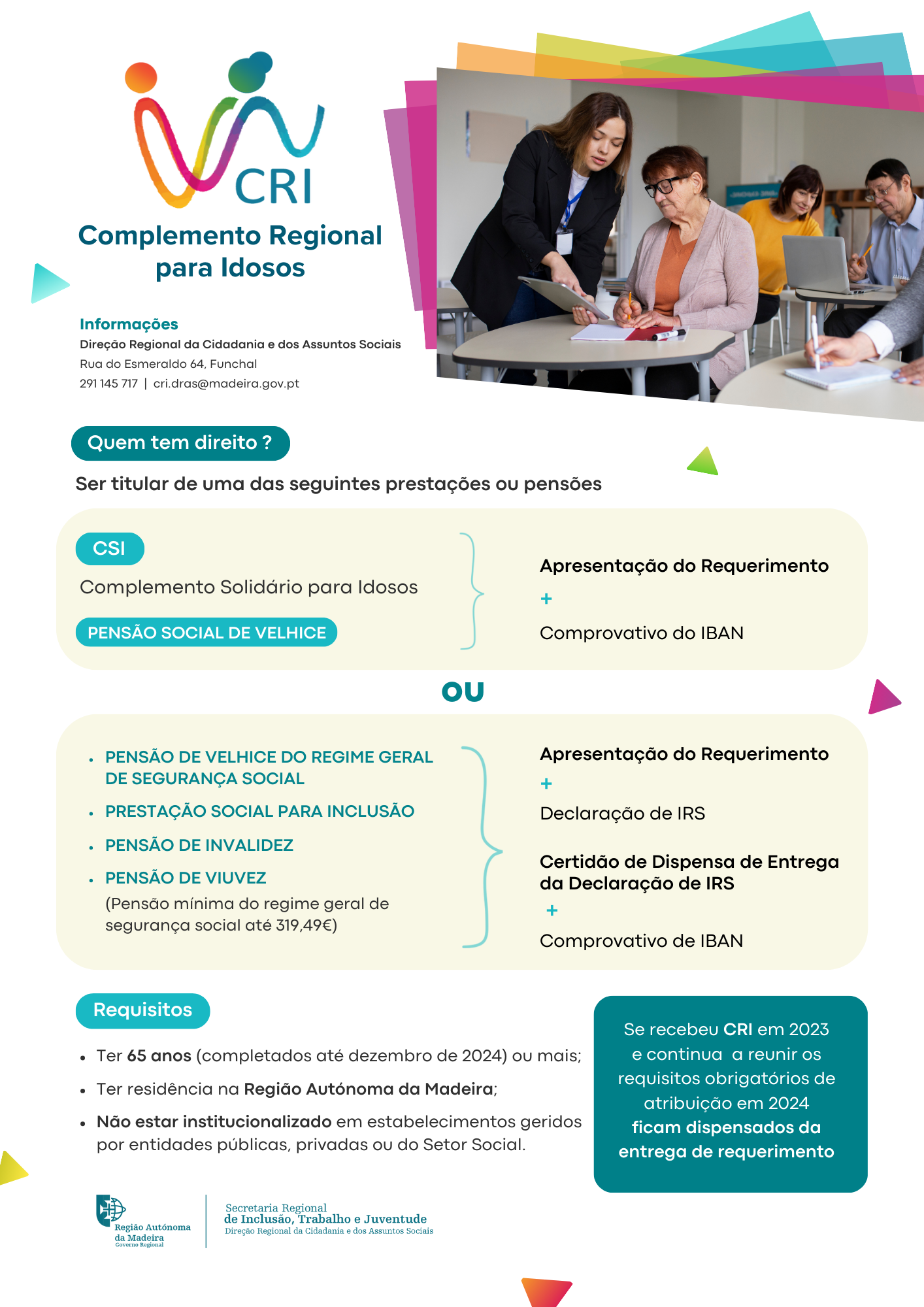 Para mais informações sobre o Complemento Regional Para Idosos, consulte o separador anexos ou estabeleça contacto através do seguinte número: 291 145 717, ou através do seguinte correio eletrónico: cri.dras@madeira.gov.pt