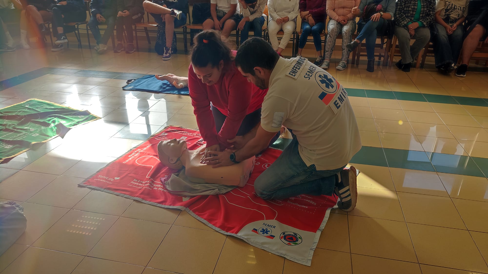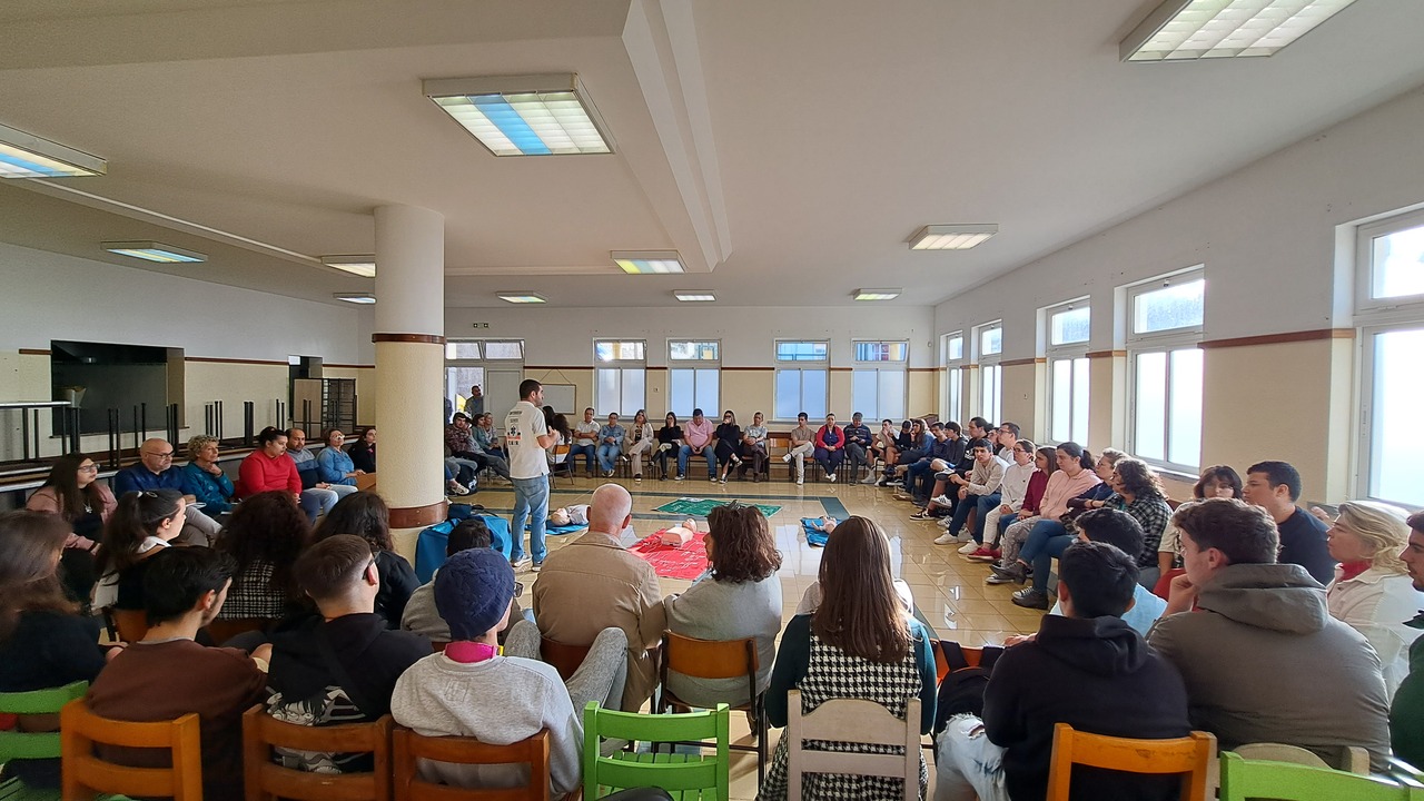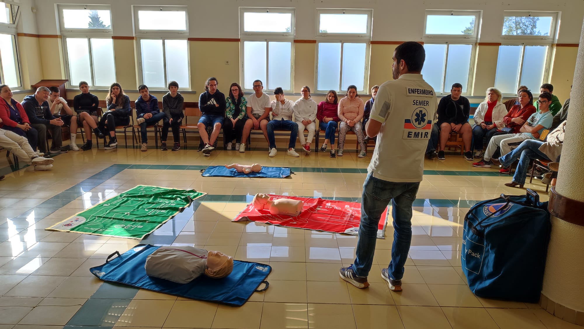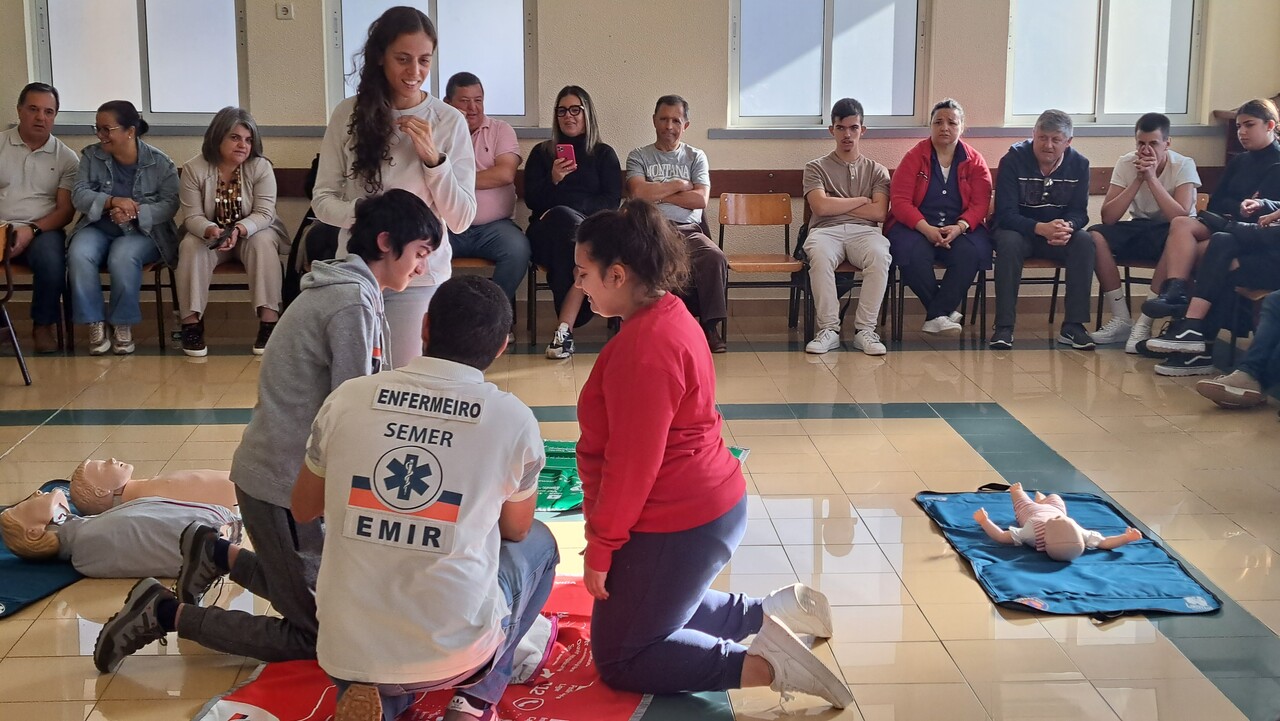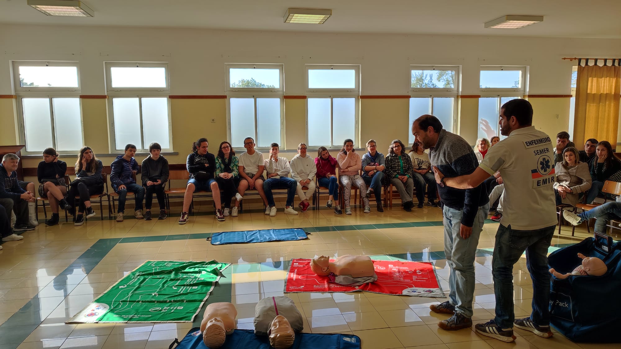 Foram abordados os procedimentos a ter em caso de socorro: a avaliação da vítima; o contacto para a linha de emergência – 112; práticas de manobras de suporte básico de vida; posição lateral de segurança da vítima.