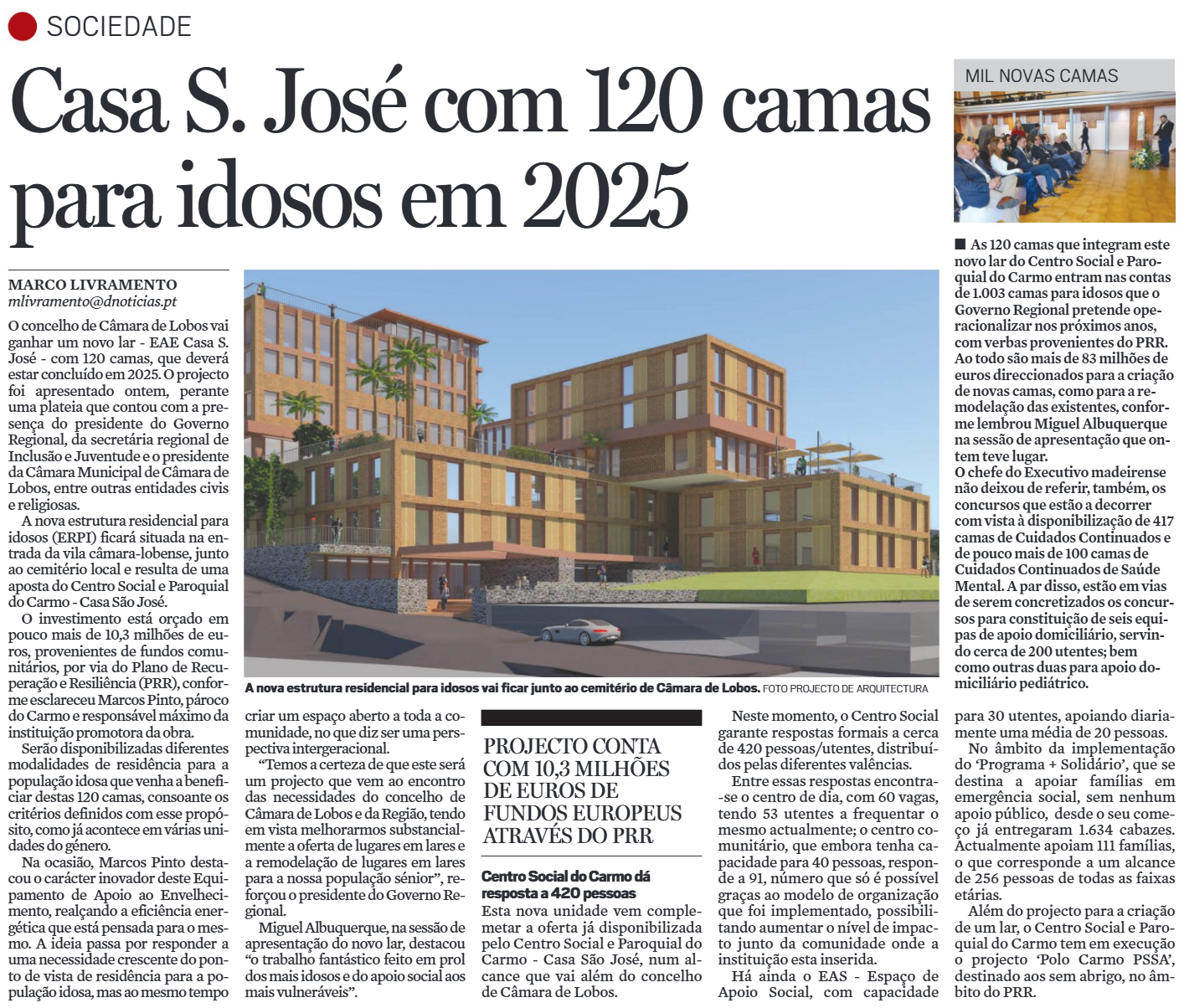 O Centro Social e Paroquial recebeu hoje a visita de Ana Sousa, secretária regional de Inclusão e Juventude, num encontro onde foram analisados os futuros projetos de construção da Estrutura Residencial para Idosos, com capacidade para 120 vagas, e do Polo das Pessoas em Situação de Sem-abrigo, no Carmo.