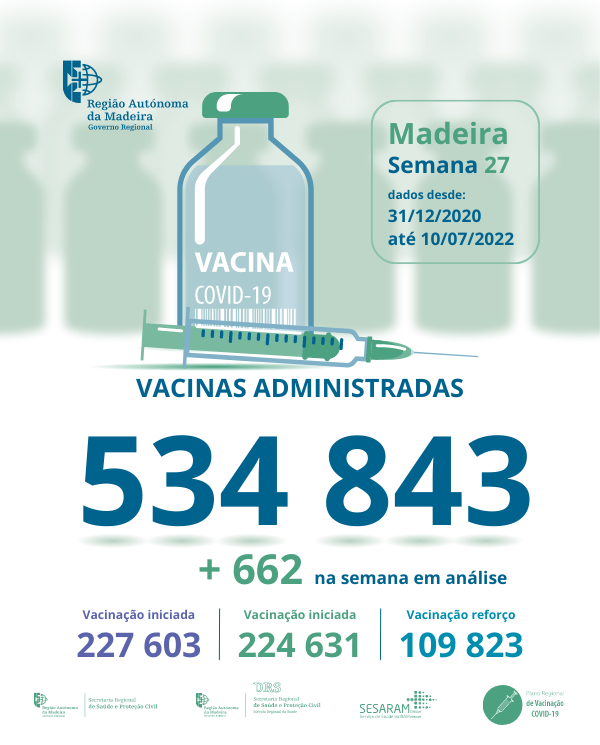 Do número total de vacinas administradas na RAM (534 843), 227 603 correspondem à administração da primeira dose, 224 631 doses de vacinação completa e 109 823 doses de reforço das quais 1 003 são segundas doses de reforço.
