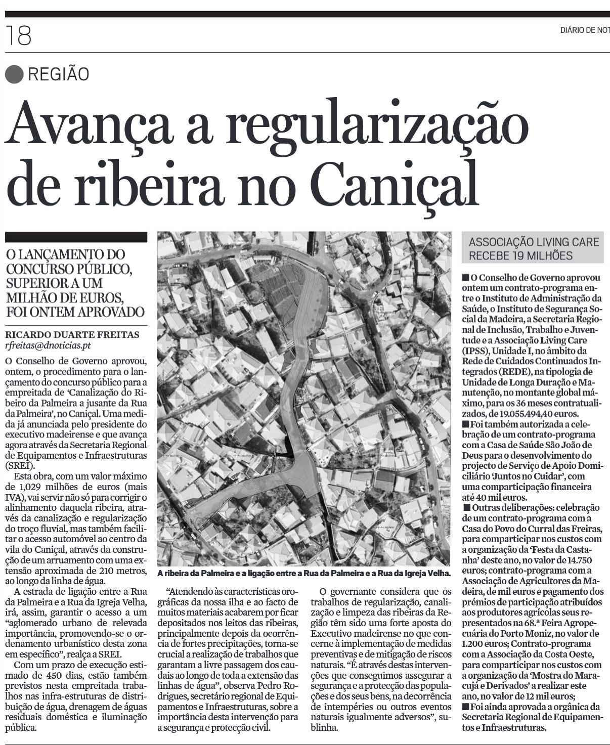 O Governo Regional, através da secretaria Regional de Equipamentos e Infraestruturas, vai lançar, até ao final deste mês, o procedimento de contratação pública para a construção da estrada de ligação entre a Rua da Palmeira e a Rua da Igreja Velha e regularização da ribeira da Palmeira, na freguesia do Caniçal.