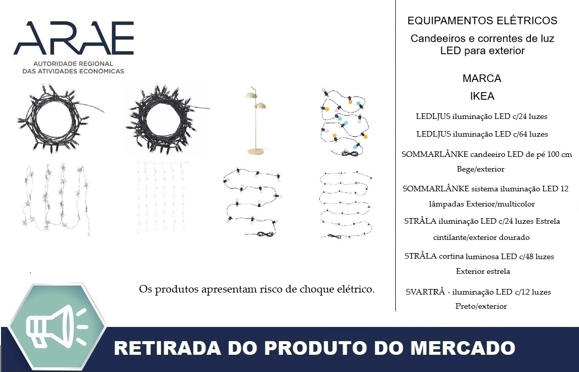 Alerta ARAE – Ação de Recolha de Produtos referente a lotes de candeeiros e correntes de luz LED para exterior das gamas LEDLJUS, SOMMARLÅNKE, STRÅLA e SVARTRÅ