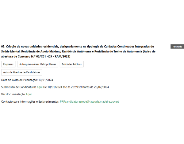 Subinvestimento C01-i05.01 - Expansão, Desenvolvimento e Melhoria da Rede de Cuidados Continuados Integrados da Região Autónoma da Madeira (REDE) - Criação de novas unidades residenciais, designadamente na tipologia de Cuidados Continuados Integrados de Saúde Mental: Residência de Apoio Máximo; Residência Autónoma; Residência de Treino de Autonomia