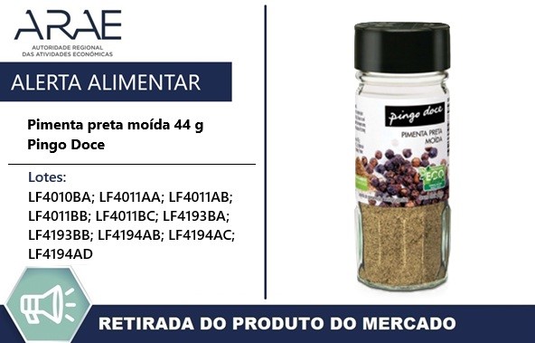 Alerta ARAE - Retirada do mercado do produto "Pimenta preta moída 44 g" - Marca Pingo Doce