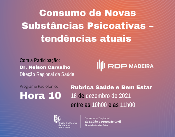 Colaboração da DRS com a RDP-Madeira no programa radiofónico "Hora 10", Rubrica "Saúde e Bem-Estar", com o tema "Consumo de Novas Substâncias Psicoativas – tendências atuais", no passado dia 16 de dezembro. Este programa teve a participação do Psicólogo e Diretor da Unidade Operacional de Intervenção em Comportamentos Aditivos e Dependências, da DRS.