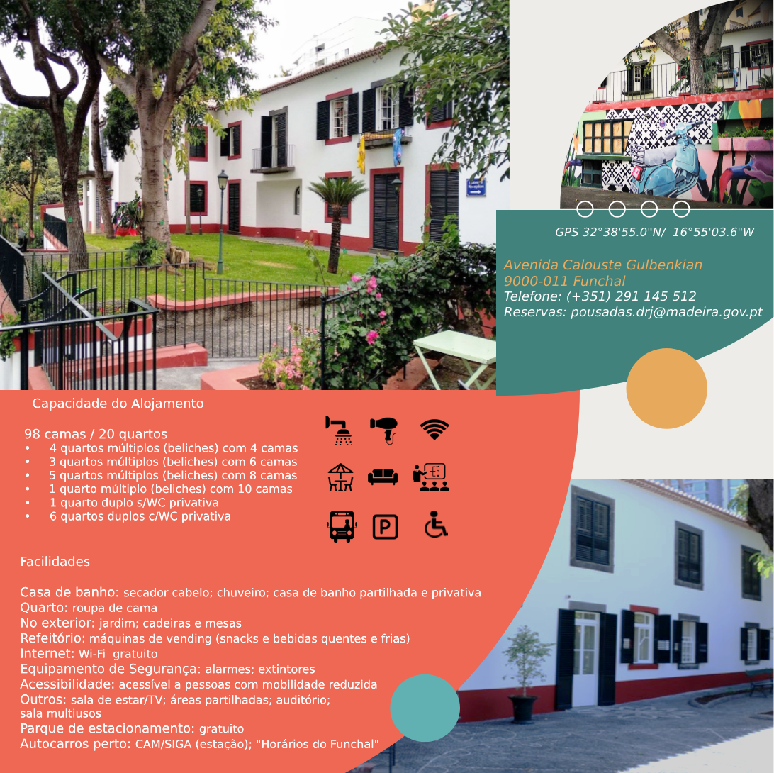 Contactos: DIREÇÃO REGIONAL DE JUVENTUDE CENTRO DE JUVENTUDE DO FUNCHAL Telefone: (+351) 291 145 512 | 967 452 037 Reservas: pousadas.drj@madeira.gov.pt