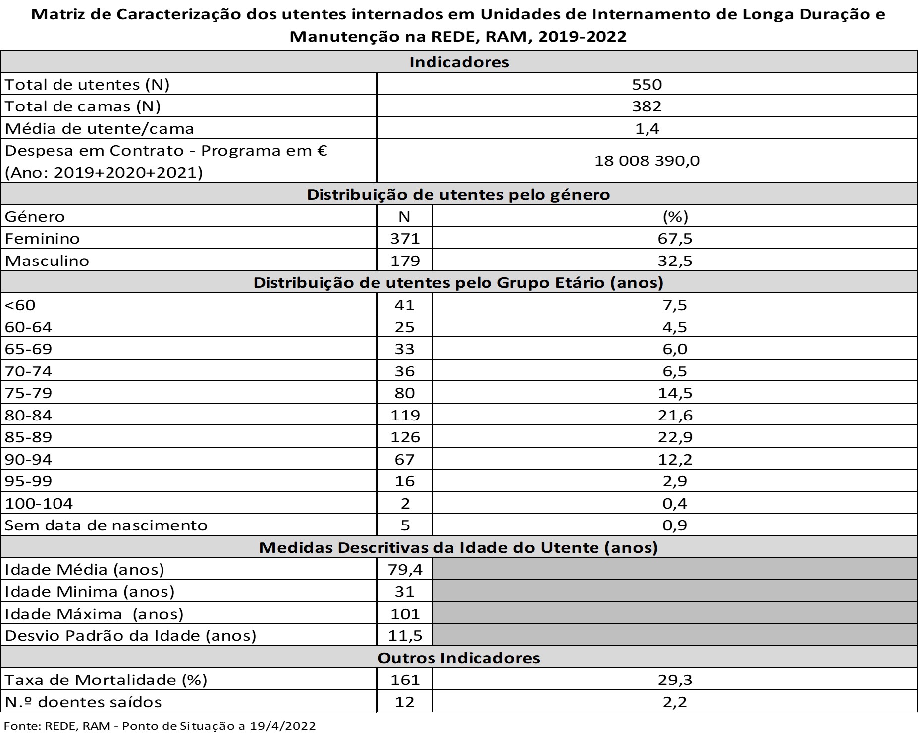 Da caracterização e ponto de situação atual (19/04/2022), no universo das 382 camas contratualizadas que corresponderam a um investimento em contrato-programa de 18 008 390,00 € para o período 2019-2021, observa-se o seguinte:
