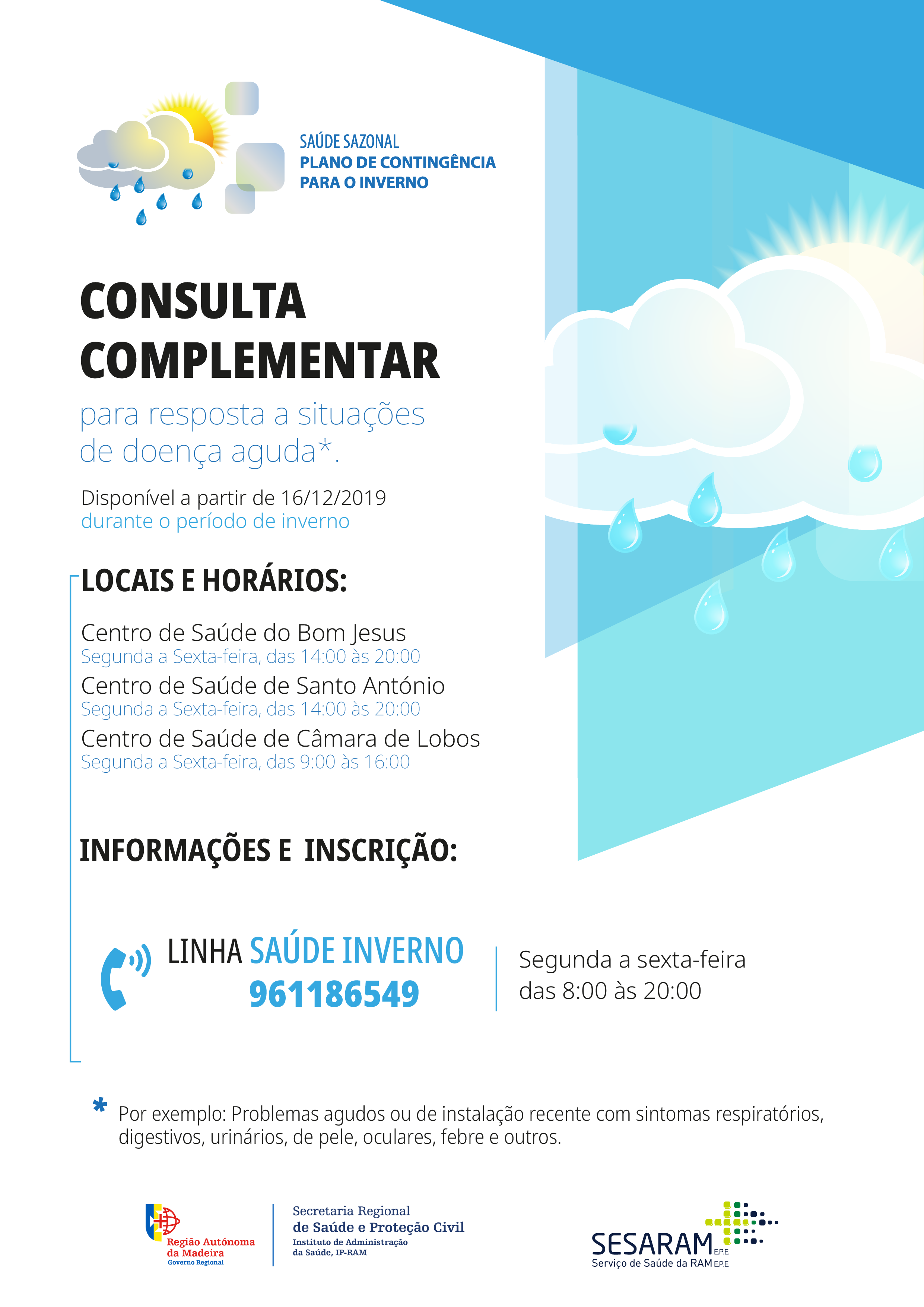 Esta consulta é criada no âmbito do Plano de Contingência para o Inverno apresentado pelo Instituto de Administração da Saúde, IP-RAM, em vigor desde outubro até maio de 2020, o qual integra orientações estratégicas e referenciais para atuação nas instituições do sistema de saúde da RAM.