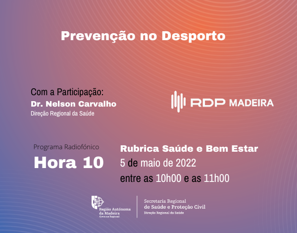 No dia 5 de maio, o tema a abordar na RDP-Madeira será "Prevenção no Desporto", com a participação do Dr. Nelson Carvalho, Psicólogo e Diretor da Unidade Operacional de Intervenção em Comportamentos Aditivos e Dependências, da Direção Regional da Saúde.