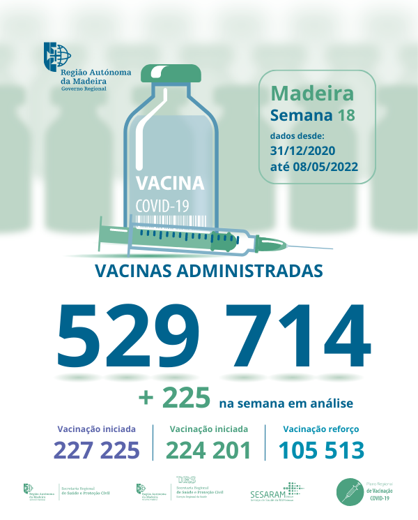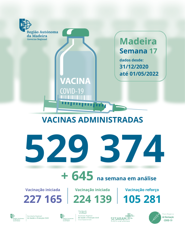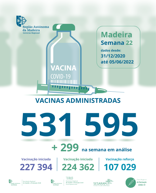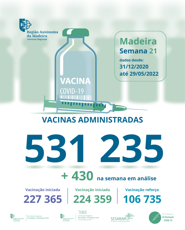 Até ao dia 01 de maio de 2022 foram administradas na Região Autónoma da Madeira, 529 374 vacinas contra a COVID-19, desde dia 31 de dezembro de 2020.