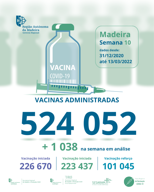 Até ao dia13de marçode 2022 foram administradas na Região Autónoma da Madeira, 524052vacinas contra a COVID-19, desde dia 31 de dezembro de 2020.