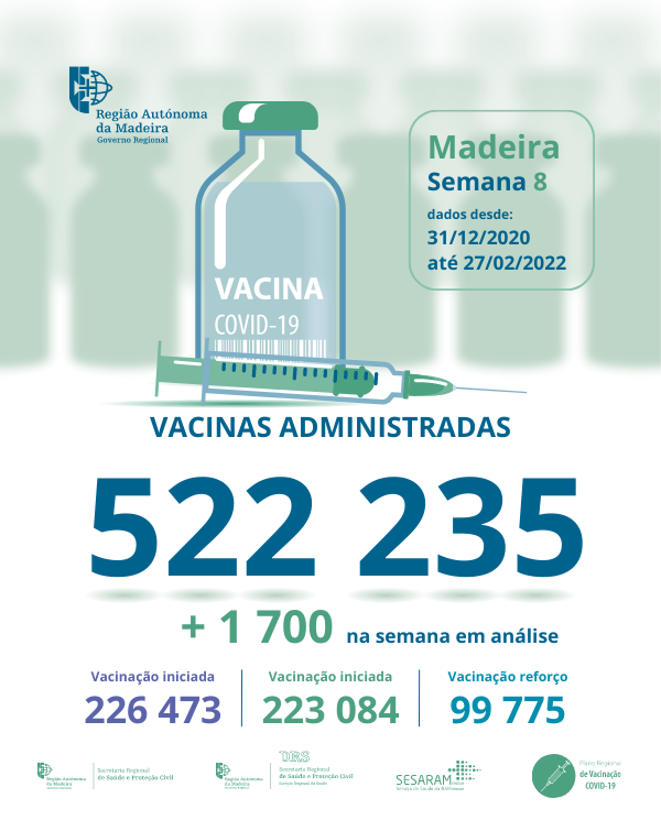 Até ao dia27de fevereirode 2022 foram administradas na Região Autónoma da Madeira, 522235vacinas contra aCOVID-19, desde dia 31 de dezembro de 2020.