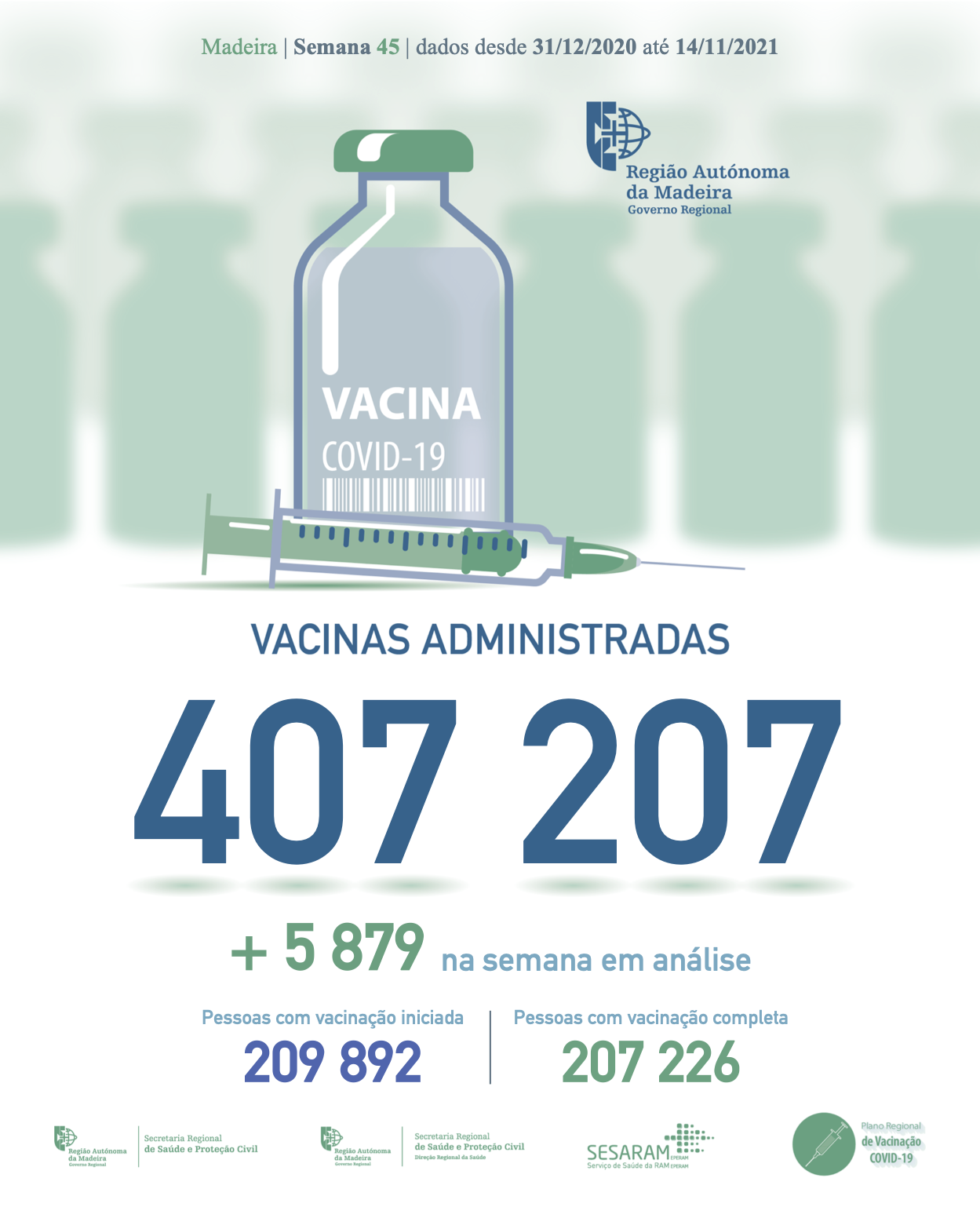 Do número total de vacinas administradas na RAM (537 264), 227 808 correspondem à administração da primeira dose, 224 869 doses de vacinação completa e 111 826 doses de reforço das quais 1 970 são segundas doses de reforço.