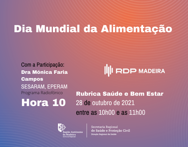 No dia 28 de outubro será abordado o tema "Dia Mundial da Alimentação", na RDP-Madeira, com a participação do Dra. Mónica Faria Campos, do SESARAM, EPERAM.