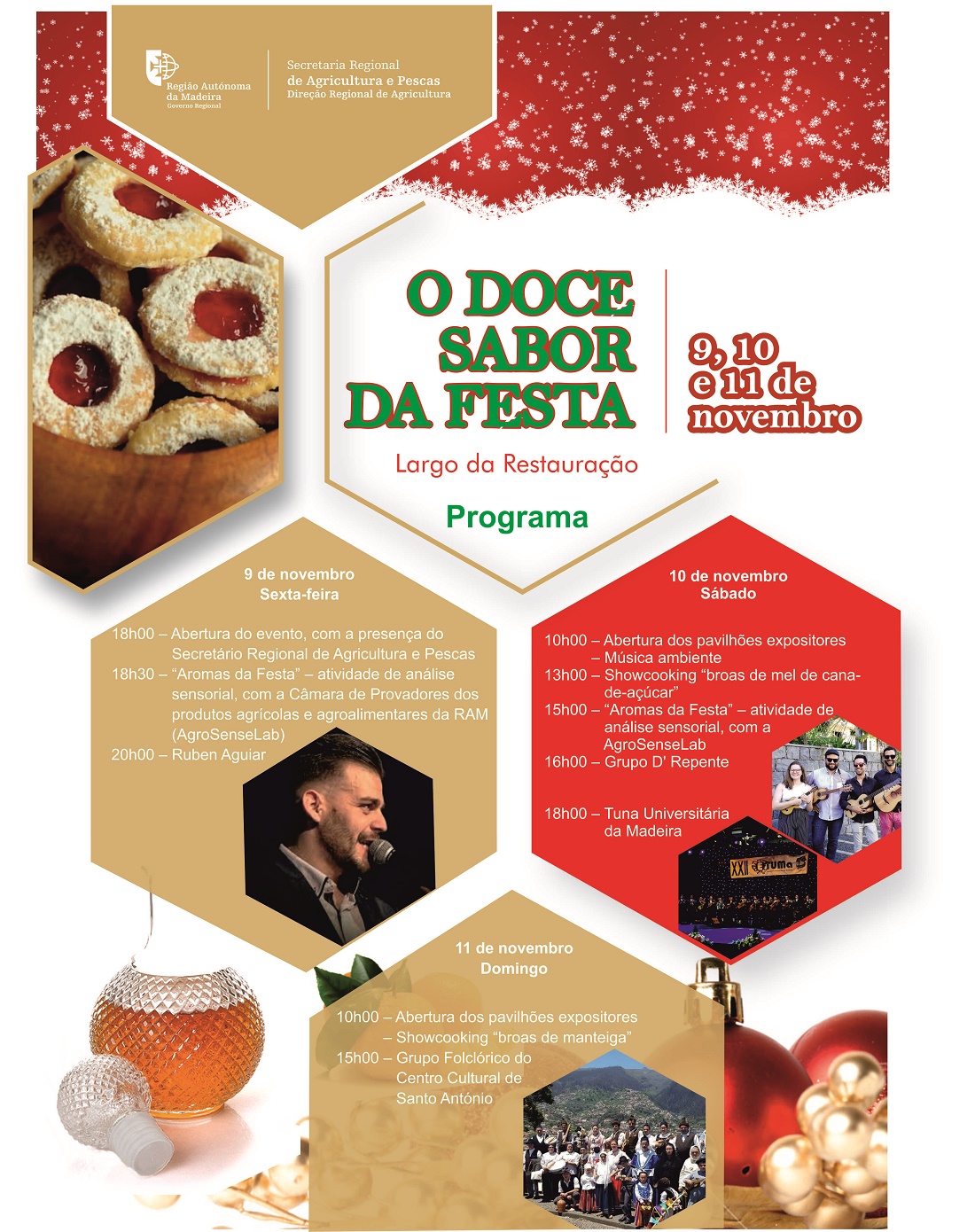 Mas o doce sabor da Festa, além de constituir uma oportunidade para as empresas do setor darem a conhecer os seus produtos, o programa conta com as presenças confirmadas do cantor Ruben Aguiar (sexta-feira, dia 09, às 20h), do grupo D’ Repente (sábado, dia 10, às 16h), da Tuna Universitária da Madeira (sábado, dia 10, às 18h) e do Grupo Folclórico do Centro Cultural de Santo António (domingo, dia 11, às 15h), bem como com atividades dinamizadas pela Câmara de Provadores dos Produtos Agrícolas e Agroalimentares da RAM (AgroSenseLab), com o nome “Aromas da Festa”, e demonstrações da doçaria típica da época festiva que se aproxima.