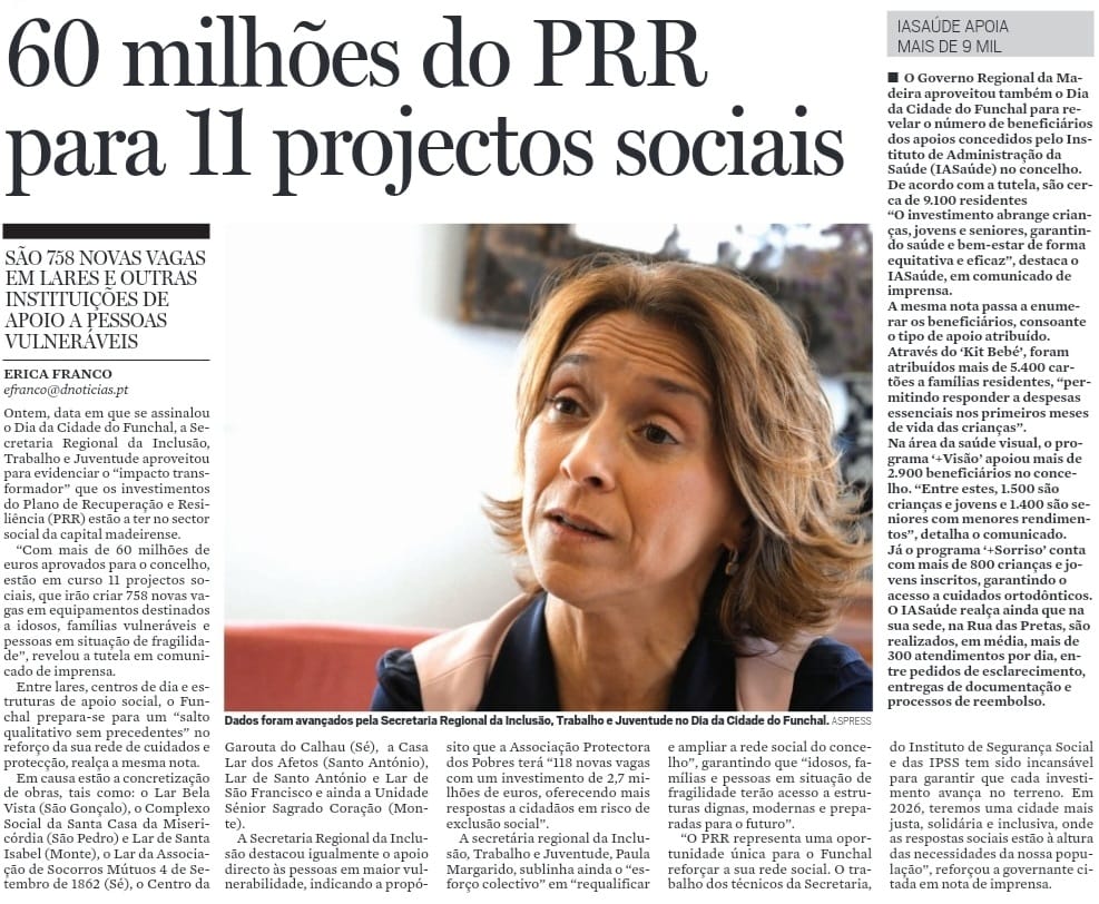 No Dia da Cidade do Funchal, a Secretaria Regional de Inclusão, Trabalho e Juventude sublinha o impacto transformador que os investimentos do Plano de Recuperação e Resiliência (PRR) estão a ter no setor social da capital madeirense.