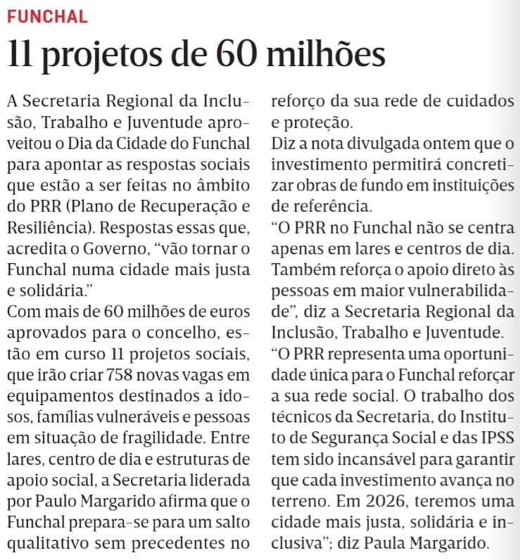 “O PRR representa uma oportunidade única para o Funchal reforçar a sua rede social. O trabalho dos técnicos da Secretaria, do Instituto de Segurança Social e das IPSS tem sido incansável para garantir que cada investimento avança no terreno. Em 2026, teremos uma cidade mais justa, solidária e inclusiva, onde as respostas sociais estão à altura das necessidades da nossa população.”