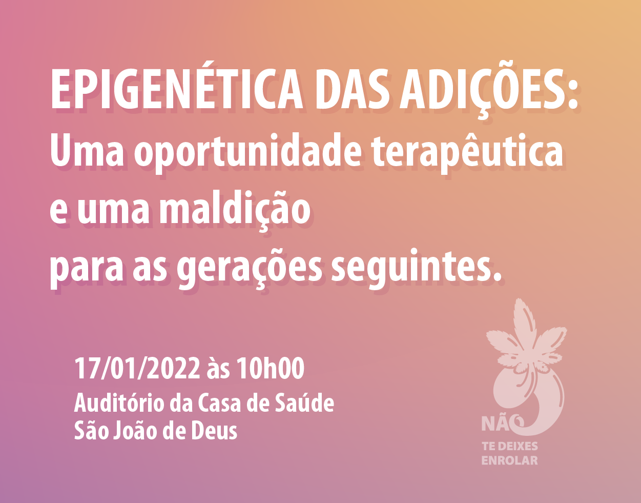 A Direção Regional da Saúde, através da Unidade Operacional de Intervenção em Comportamentos Aditivos e Dependências (UCAD) e em parceria com a Casa de Saúde São João de Deus (CSSJD) irá realizar a Conferência "EPIGENÉTICA DAS ADIÇÕES: Uma oportunidade terapêutica e uma maldição para as gerações seguintes", no próximo dia 17 de janeiro, às 10 horas, no auditório da CSSJD.