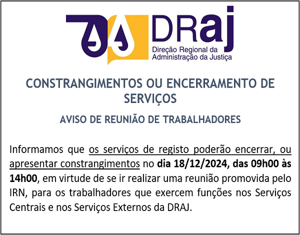 Informamos que os serviços de registo poderão encerrar, ou apresentar constrangimentos no dia 18/12/2024, das 09h00 às 14h00, em virtude de se ir realizar uma reunião promovida pelo IRN, para os trabalhadores que exercem funções nos Serviços Centrais e nos Serviços Externos da DRAJ.