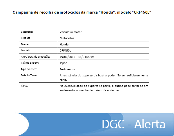 Campanha de recolha de motociclos da marca “Honda", modelo "CRF450L"