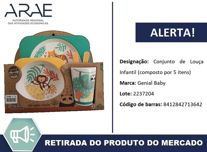 Alerta ARAE - Retirada do Mercado de Conjunto de Louça Infantil da Marca "Genial Baby" devido à Migração Excessiva de Melamina