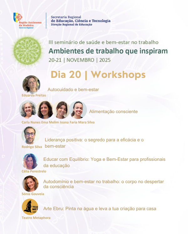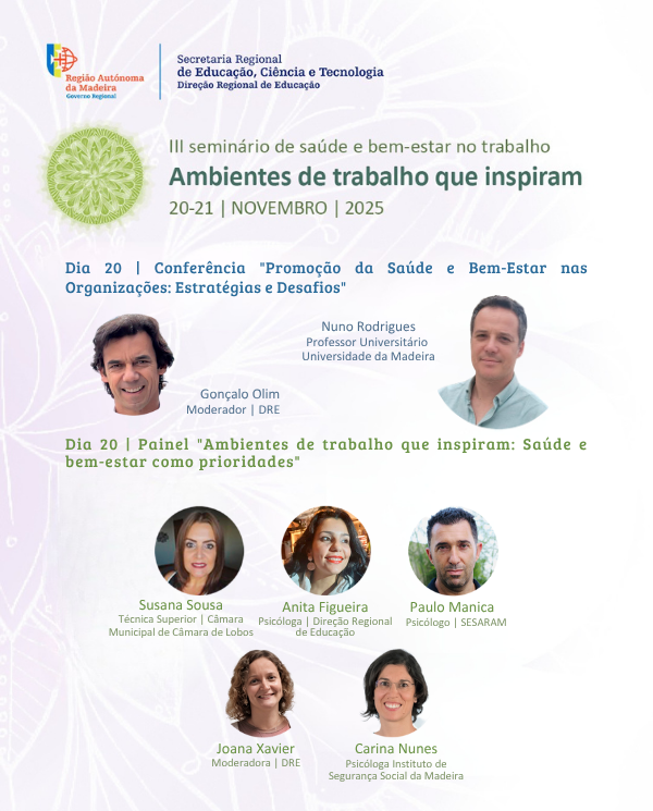 A Direção Regional de Educação, através do Núcleo de Saúde e Bem-Estar no Trabalho em Contexto Educativo, promove o III Seminário de saúde e do bem-estar no trabalho: ambientes de trabalho que inspiram, a realizar-se nos dias 20 e 21 de novembro de 2025, no Museu de Imprensa da Madeira, em Câmara de Lobos.