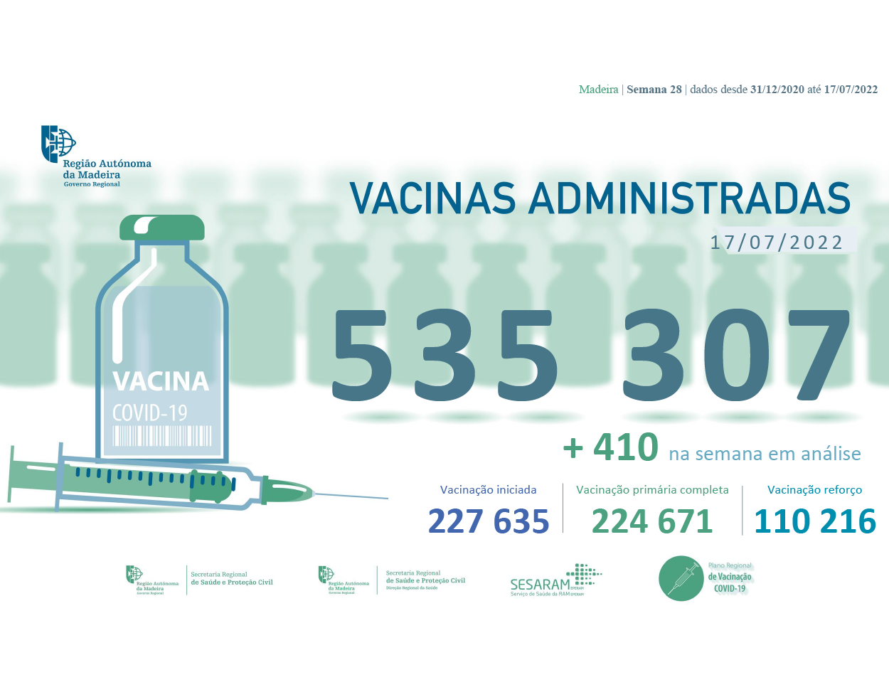 o número total de vacinas administradas na RAM (535 307), 227 635 correspondem à administração da primeira dose, 224 671 doses de vacinação completa e 110 216 doses de reforço das quais 1 139 são segundas doses de reforço.