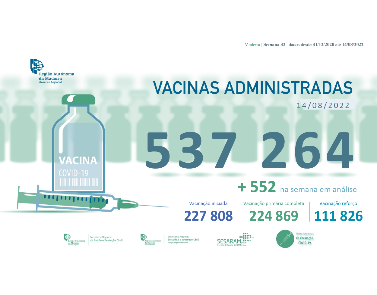Até ao dia 07 de agosto de 2022 foram administradas na Região Autónoma da Madeira, 536 605 vacinas contra a COVID-19, desde dia 31 de dezembro de 2020.