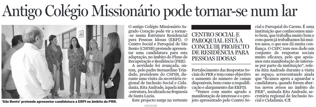O Centro Social e Paroquial de São Bento (CSPSB) está ponderar uma candidatura para a adaptação do antigo Colégio Missionário Sagrado Coração, em Estrutura Residencial para Pessoas Idosas (ERPI), sendo este um espaço privilegiado existente no coração do Funchal, e com um projeto de arquitetura praticamente concluído.