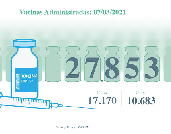 Do número total de vacinas administradas (60.014), 41.844 correspondem a administração da primeira dose e 18.170 foram segundas doses da vacina. Isto significa que 7.1% da população residente tem já a vacinação completa e 16.5%, 1 dose da vacina.