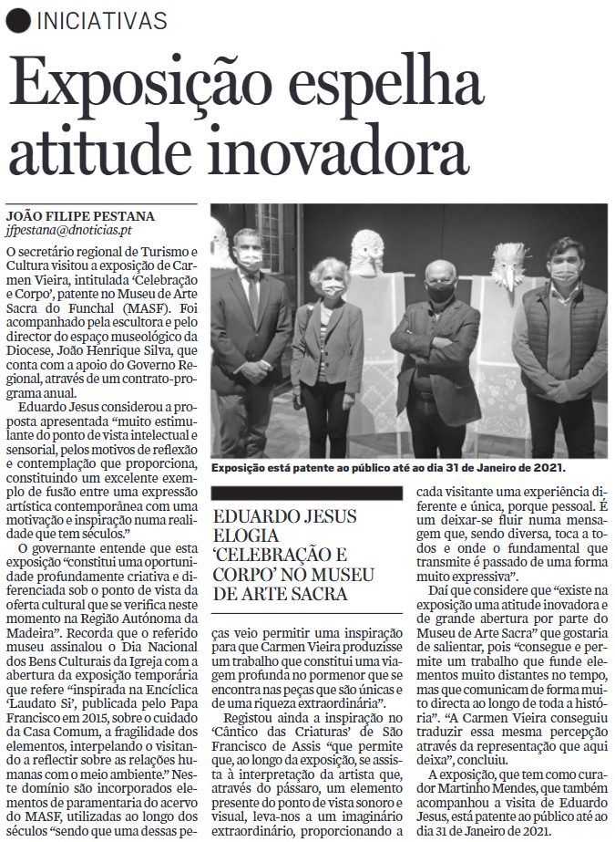Em declarações ao DN Eduardo Jesus considerou a proposta apresentada “muito estimulante do ponto de vista intelectual e sensorial, pelos motivos de reflexão e contemplação que proporciona, constituindo um excelente exemplo de fusão entre uma expressão artística contemporânea com uma motivação e inspiração numa realidade que tem séculos.” O secretário regional de Turismo e Cultura disse ainda que esta exposição “constitui uma oportunidade profundamente criativa e diferenciada sob o ponto de vista da oferta cultural que se verifica neste momento na Região Autónoma da Madeira”. Recorda que o referido museu assinalou o Dia Nacional dos Bens Culturais da Igreja com a abertura da exposição temporária que refere “inspirada na Encíclica “Laudato Si”, publicada pelo Papa Francisco em 2015, sobre o cuidado da Casa Comum, a fragilidade dos elementos, interpelando o visitando a refletir sobre as relações humanas com o meio ambiente.” Neste domínio, são incorporados elementos de paramentaria do acervo do MASF, utilizadas ao longo dos séculos “sendo que uma dessas peças veio permitir uma inspiração para que Carmen Vieira produzisse um trabalho que constitui uma viagem profunda no pormenor que se encontra nas peças que são únicas e de uma riqueza extraordinária”.
